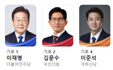 차기 대선을 앞두고 이재명(더불어민주당), 김문수(국민의힘), 이준석(개혁신당) 세 후보가